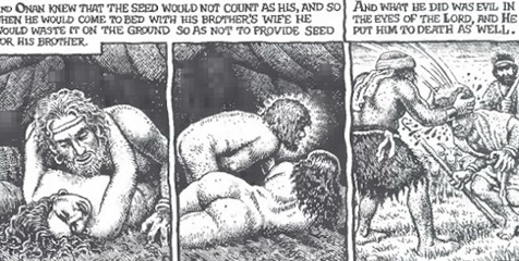 | A sorte de Onã é que Deus é bondoso e, por isso, apenas o condenou eternamente ao fogo do Inferno por ejacular fora da cunhada. in The Book of Genesis Illustrated |