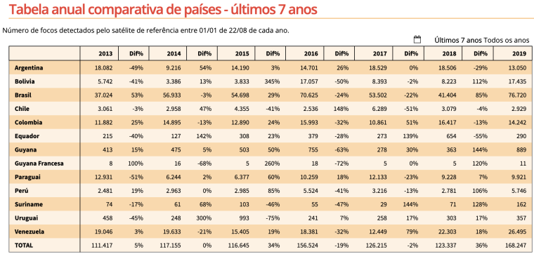 Nesta tabela, chama a atenção que o número de focos aumentou significativamente no Brasil – 85%, passando de 41.404 para 76.720 focos. Neste mesmo período, no entanto, houve aumento ainda mais significativo em outros países da região amazônica: 112% na Bolívia, 144% na Guyana, 120% na Guyana Francesa!!!, 106% no Peru e 128% no Suriname.